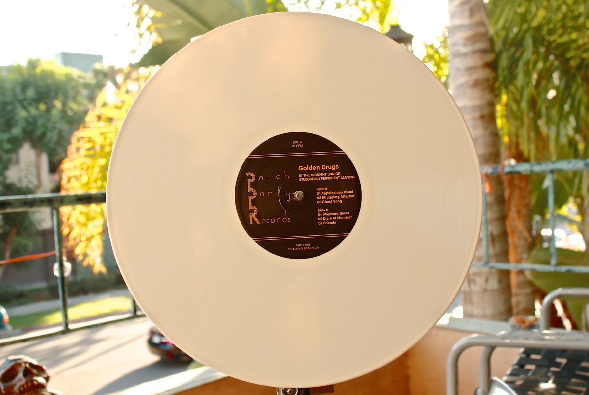 Debut 12" White-Vinyl LP from GOLDEN DRUGS: dream-pop folk-goth psych-prog out of Oakland, CA. Cover Art by Oakland artist BRETT FLANIGAN. Back-cover art by Drew Pearson.